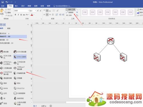 第六步:进入模板后,就可以拖动左边栏的“网络”形状,以及利用上方工具栏中的连接线等工具进行绘制啦。如下图:
