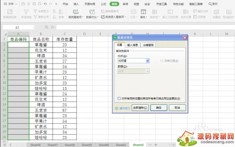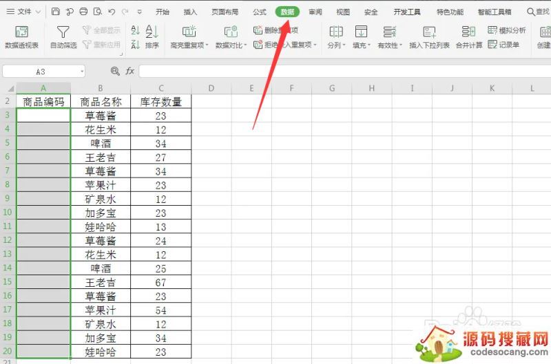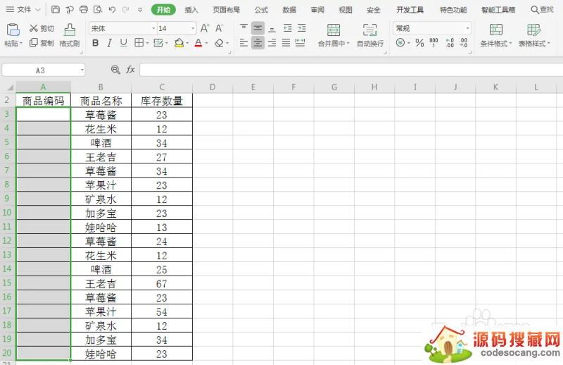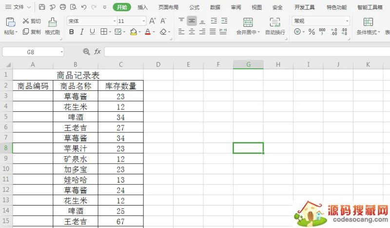 打开一个“商品记录表”,含有“商品编码”、“商品名称”及“库存数量”,我们现在需要设置录入的商品编码为6位数据。