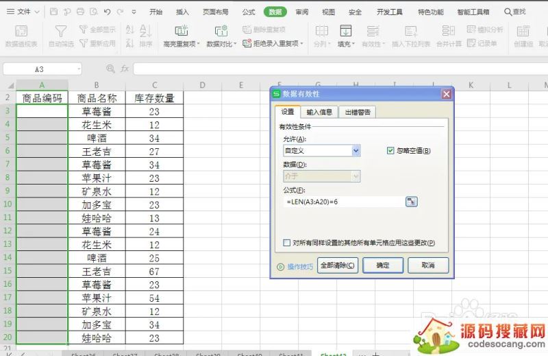 在出现的数据有效性对话框设置项下,允许下拉列表中选择“自定义”,然后在公式文本框中输入“=LEN(A3:A20)=6”.