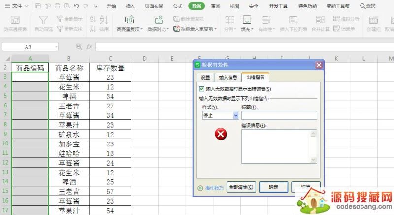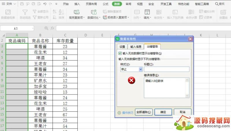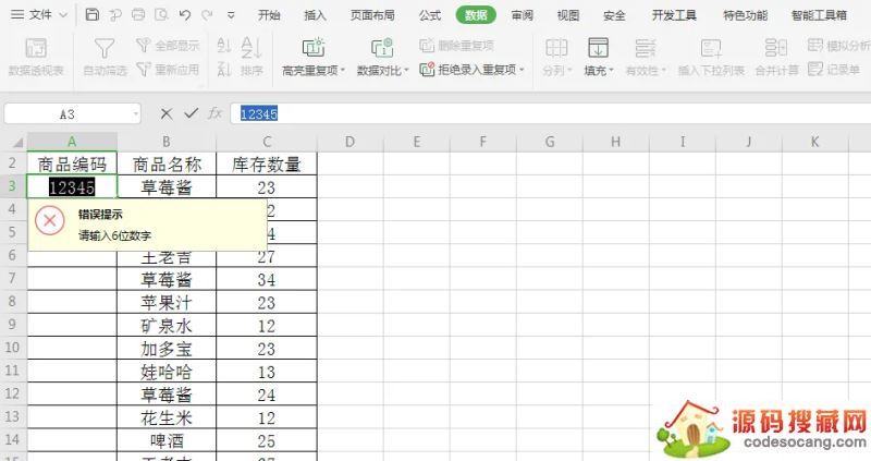当我们在“商品编码”列下录入5位数字时,表格中就会出现错误提示。如图所示