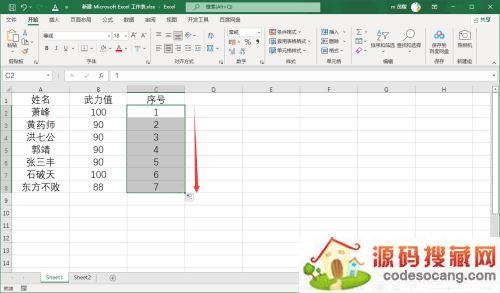 在表格最右侧插入一列作为序号,输入“1、2”使用填充柄填充序号。