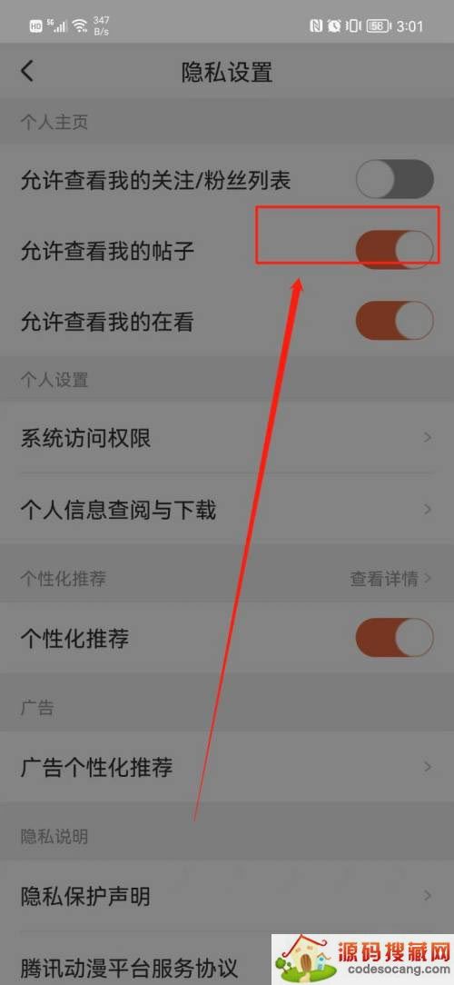第三步:点击【允许查看我的帖子】后的黄色按钮,待显示灰色即可不让别人查看帖子,详见下图所示。