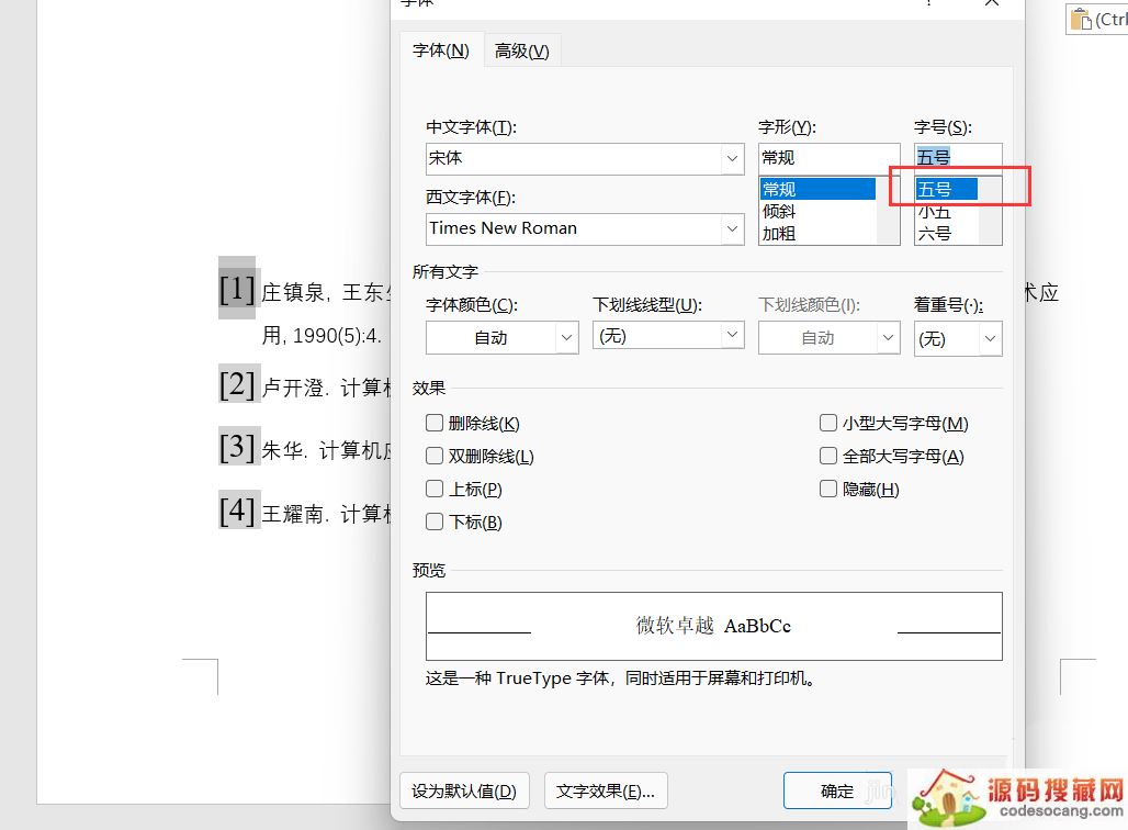 把字号改成跟后面参考文献一样的字号。这里我把三号改为五号。点击确定。