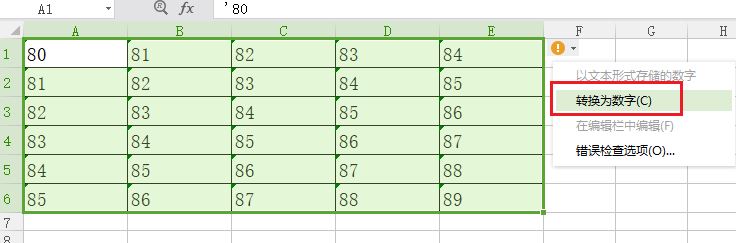 3、点击感叹号右边的下拉三角,选择转换为数字,即可将文本转换为数字。