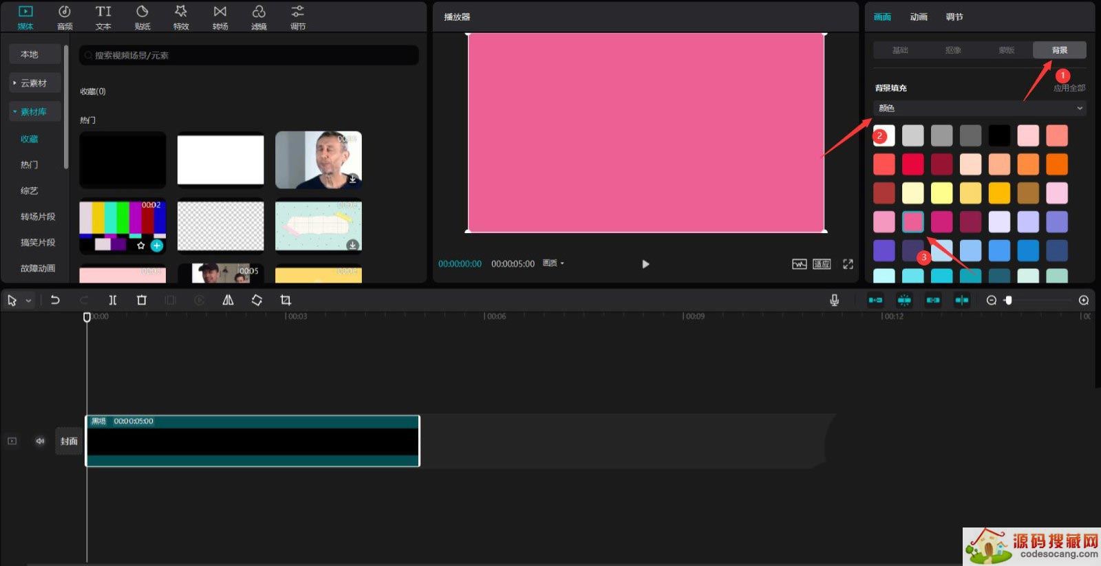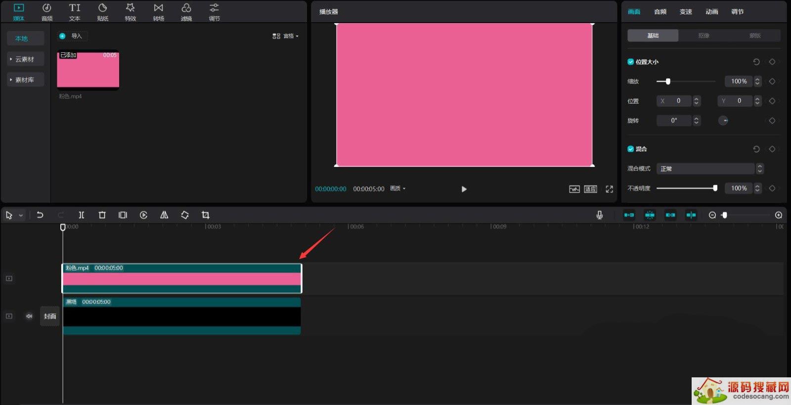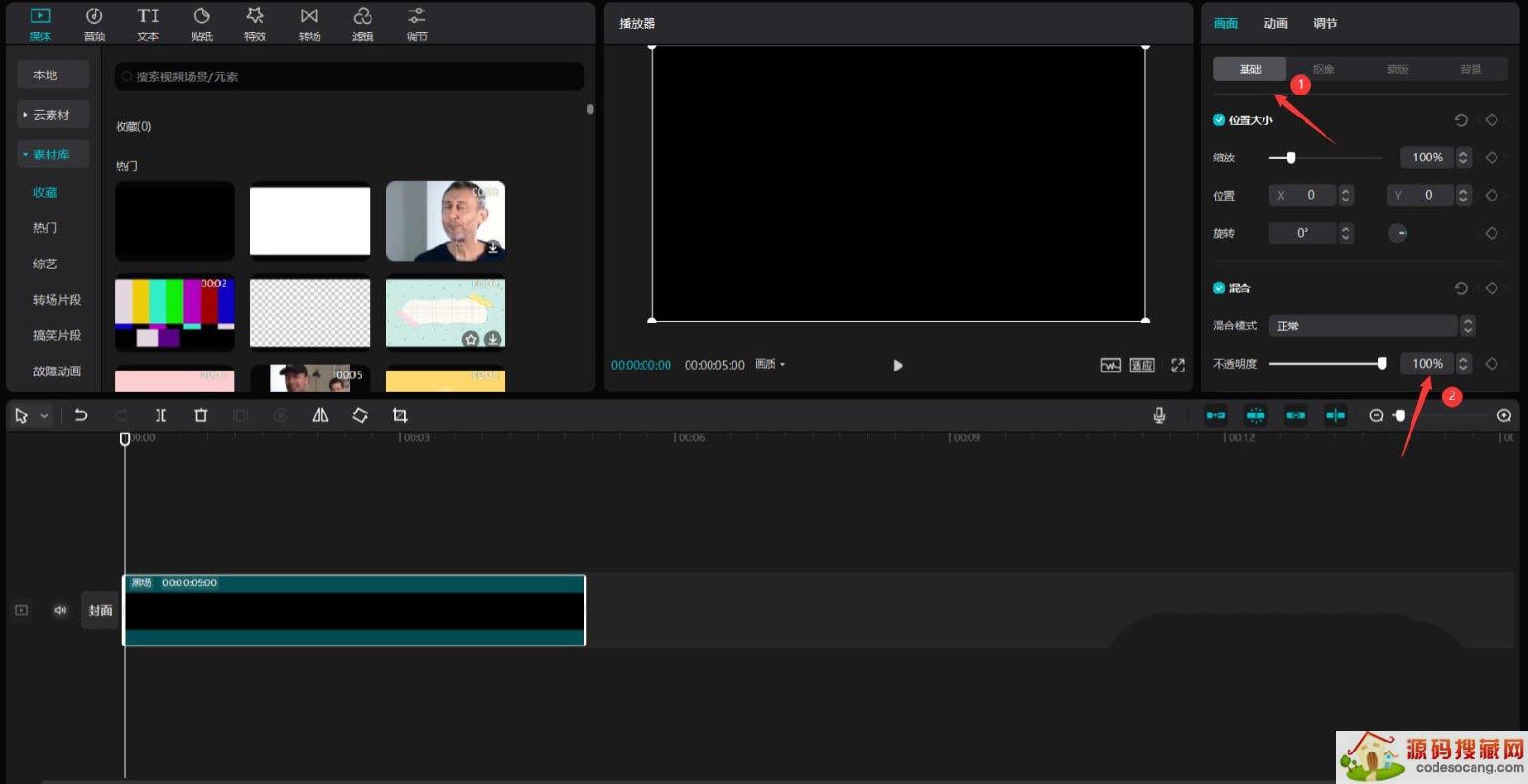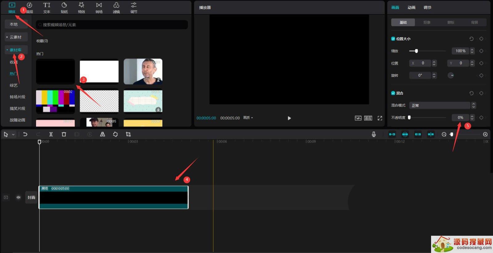 点击媒体按钮,然后点击素材库按钮,选择黑场素材,将其添加到视频轨道中,更改不透明度为0%,见下图。