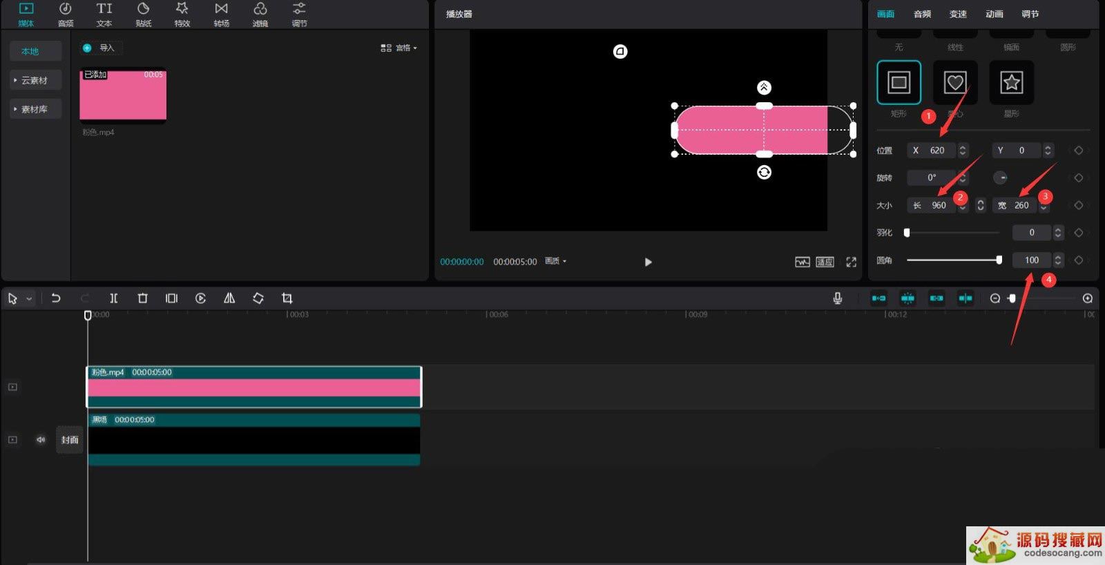 往下拉动滚动条,更改X为620,长为960,宽为260,圆角为100,见下图。