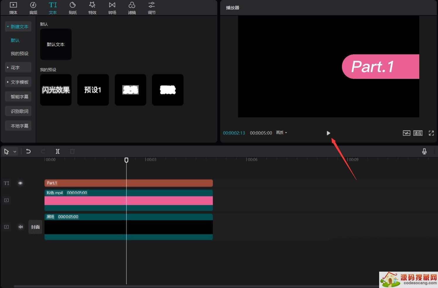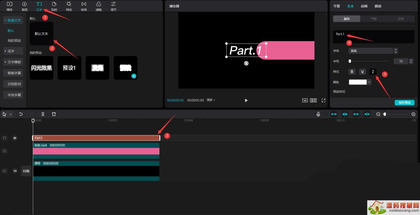 点击文本按钮,选择默认文本,将其添加到文本轨道中,更改文本内容为"Part.1",样式为斜体,见下图。