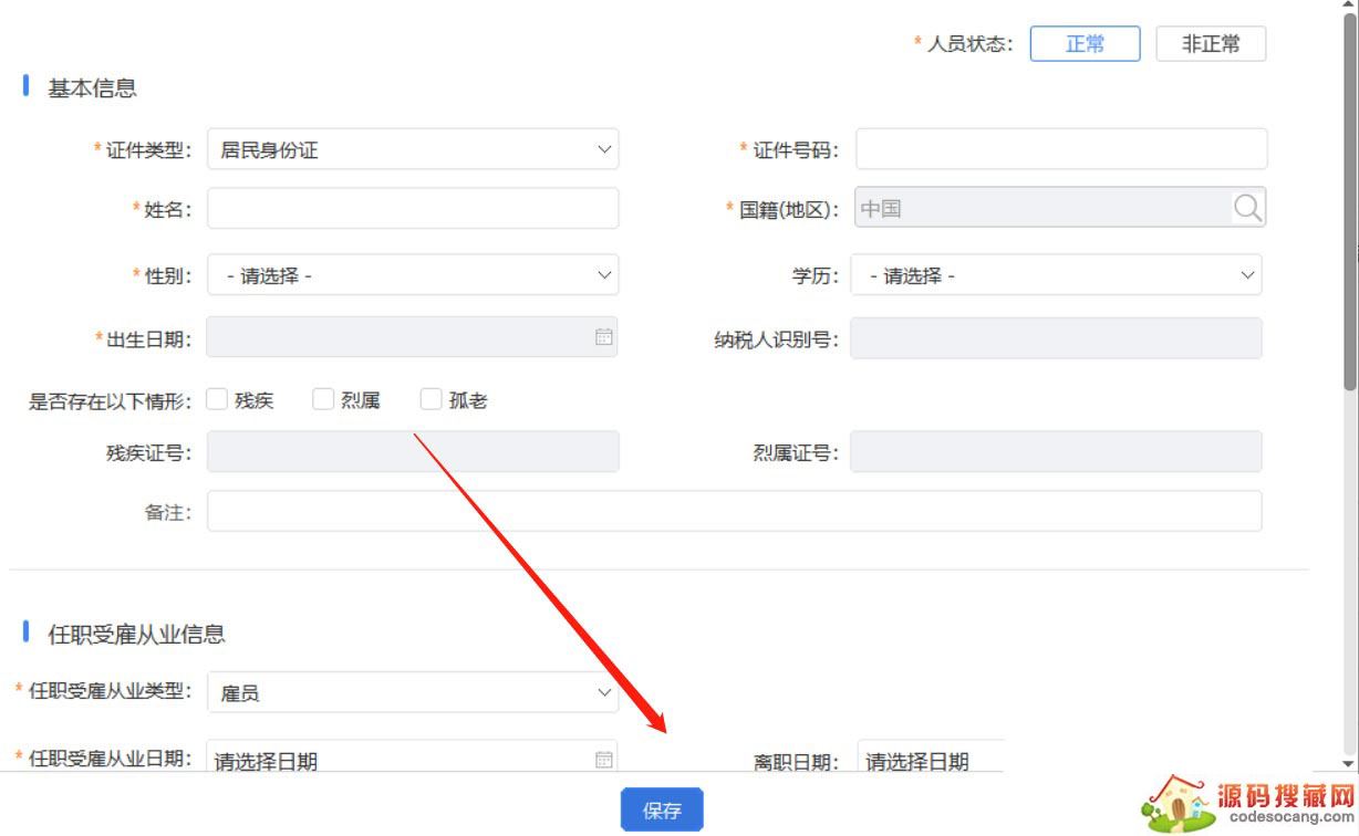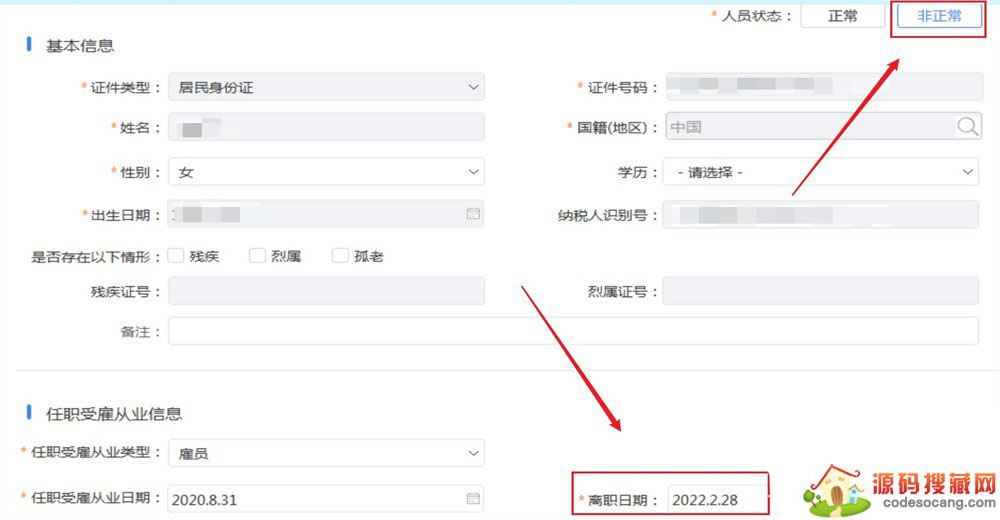 打开该离职人员的编辑页面,输入离职信息,将人员状态设置成非正常,点击保存。