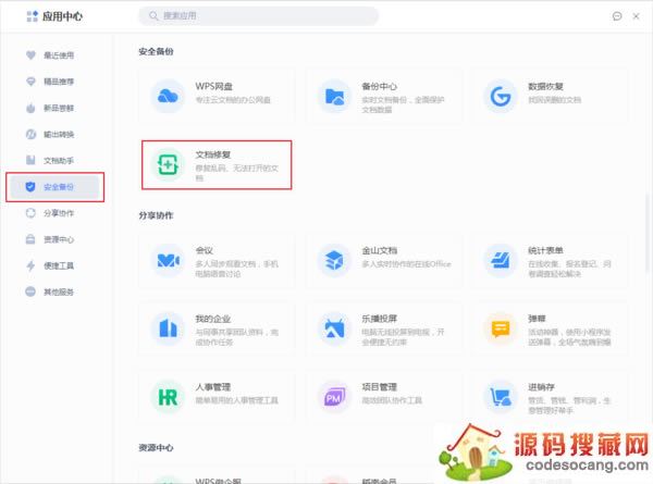 2、点击左侧的安全备份分类,选择文档修复功能。