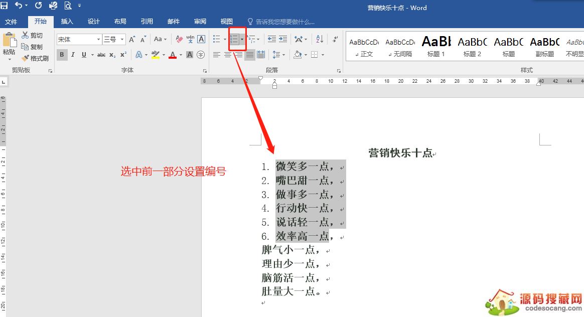 打开一个Word文件,选中前一部分段落,单击“编号”命令设置编号。