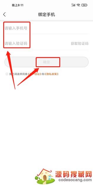 进入绑定手机界面,输入手机号、验证码,点击【确定】。