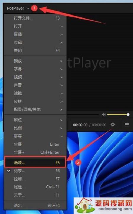第二步:打开PotPlayer主界面后,点击左上角“菜单”按钮(PotPlayer右侧下拉图标),在下拉列表中点击“选项”进入。