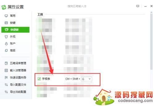 第三步:进入“快捷键”界面后,在“工具”选项下,勾选“字根表”即可设置快捷键,如图所示。