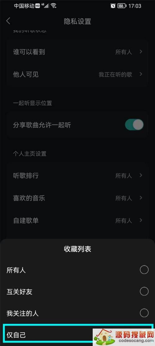 4、在弹出的窗口中选择“仅自己”,即可隐藏收藏列表。