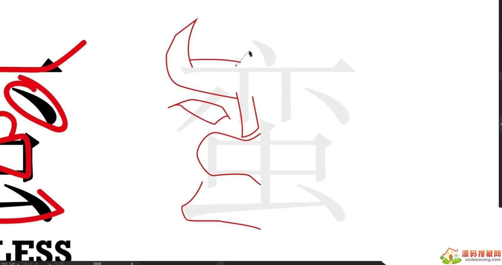 使用【文本】输入文字“蛮”,并且修改字体,调整文本的大小,进行【锁定】,然后参考文字效果,使用【钢笔】工具绘制形状路径。
