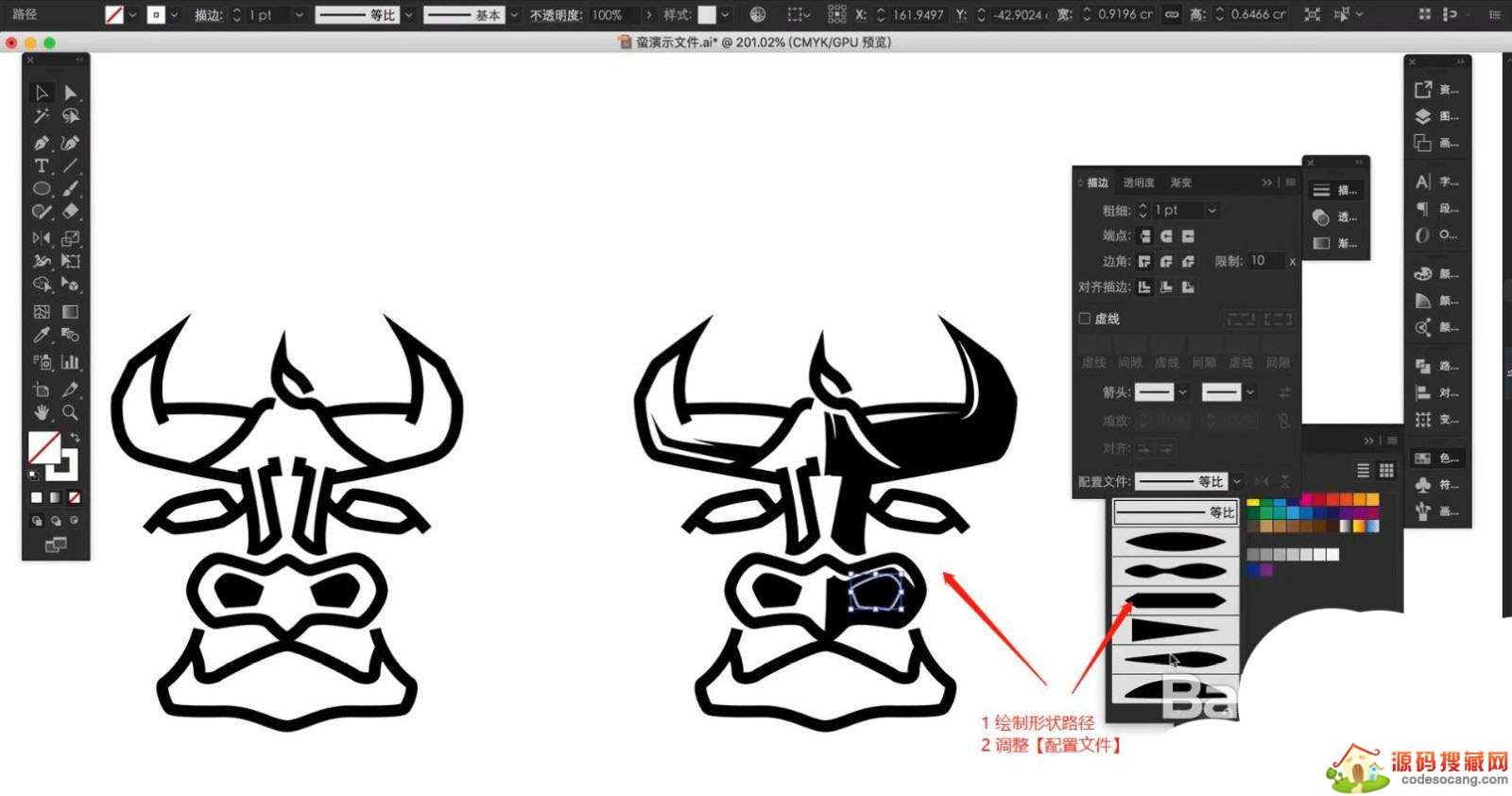再次使用【钢笔】工具绘制形状路径,然后在面板中点击【描边】然后选择【配置文件】选择不同的画笔预设。