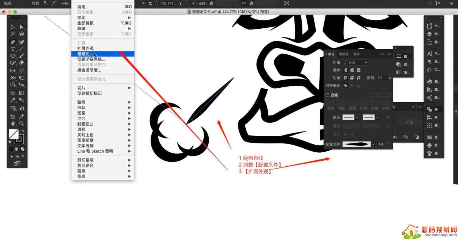 在左侧的【工具栏】中点击【钢笔】工具创建直线,然后在面板中点击【描边】然后选择【配置文件】选择不同的画笔预设,在工具栏中点击【对象 - 扩展】。