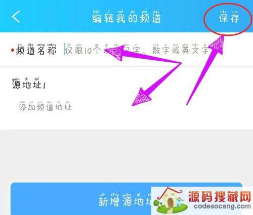第六步:输入频道名称,粘贴频道地址,点击保存就可以自建一个新频道了(如图所示)。