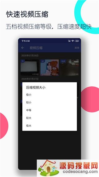 4、视频压缩:五个压缩等级,一键极速压缩,操作简单,速度超快。