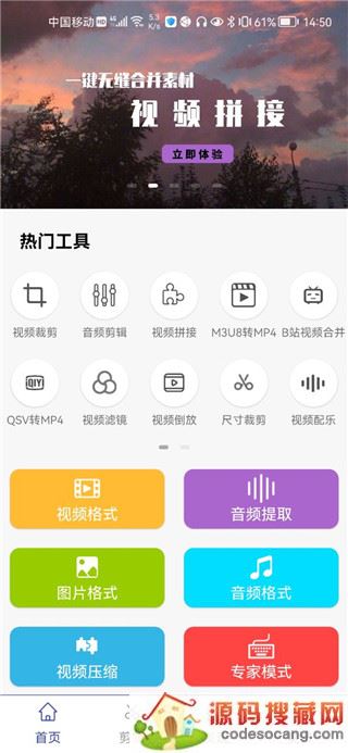 2、然后进入到软件首页,这里有多种热门工具供用户进行使用,如;视频裁剪、音频剪辑、视频拼接、M3U8转MP4、B站视频合并等等;