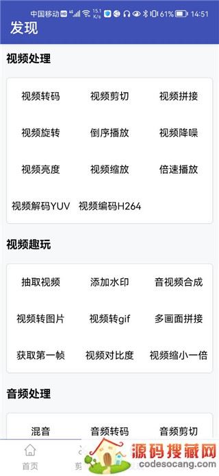 4、点击发现,这里还有多种不同的视频处理功能,如:视频转码视频剪切、视频拼接、视频旋转、倒序播放、视频降噪、视频亮度、视频缩放、倍速播放等等;