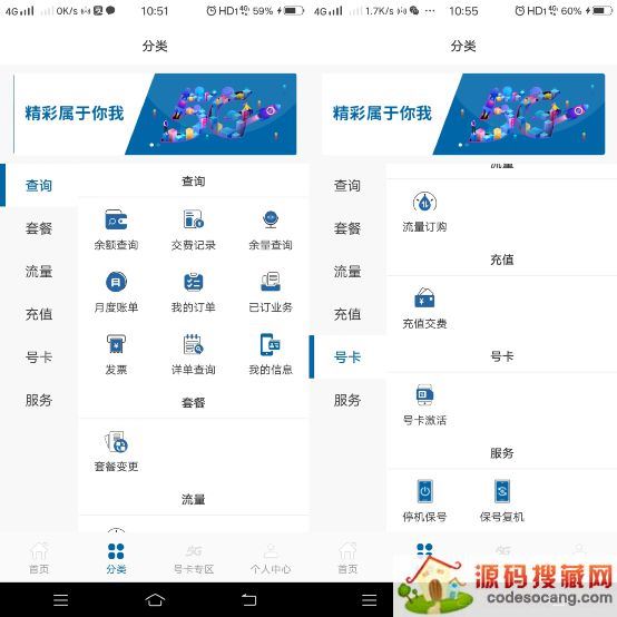 2、首页界面中,可以看到余额查询、余量查询、交费记录、套餐变更等八项特色业务,在界面底部的工具栏中,分为首页、分类、卡号专区、个人中心四项,提供了查询、套餐、流量、充值、号卡、服务等六类完整的功能项。