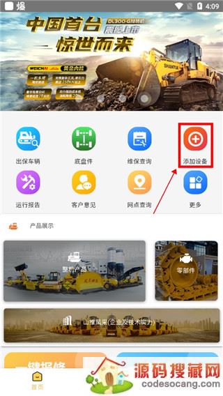 1、下载进入山推e路行app,在首页中点击添加设备;