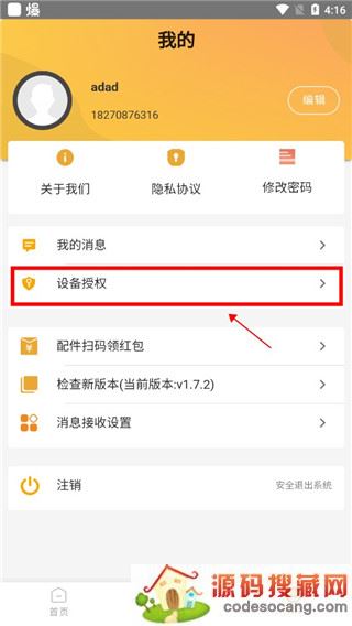 1、在我的页面中,点击进入设备授权功能;