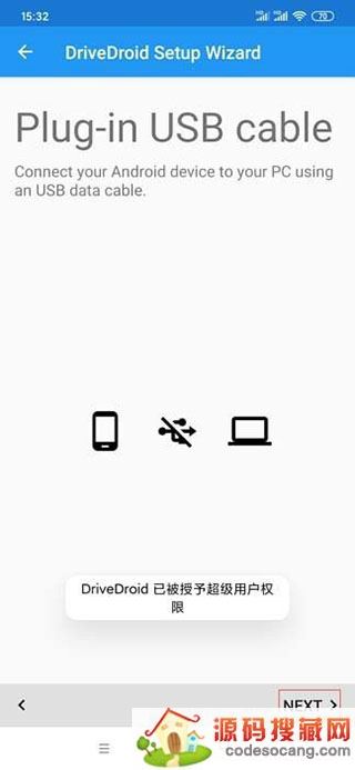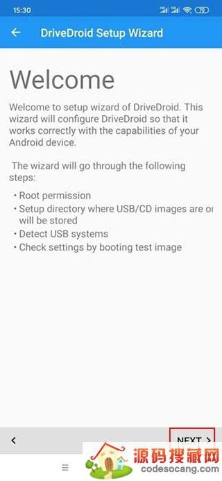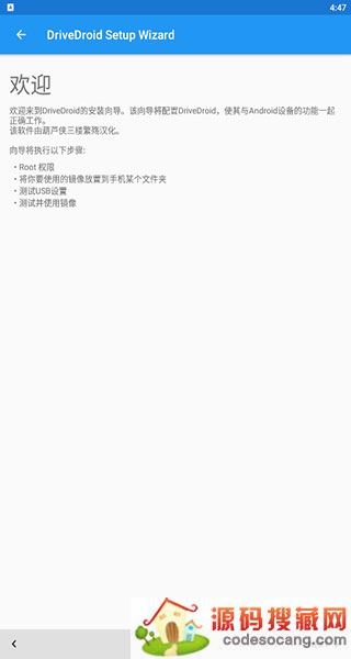 2、欢迎使用Drivedroid安装向导,本向导将通过对Drivedroid进行设置,以保证软件与你的安卓手机兼容并正确运行。此项导涉及以下几个步骤:ROOT权限的获取