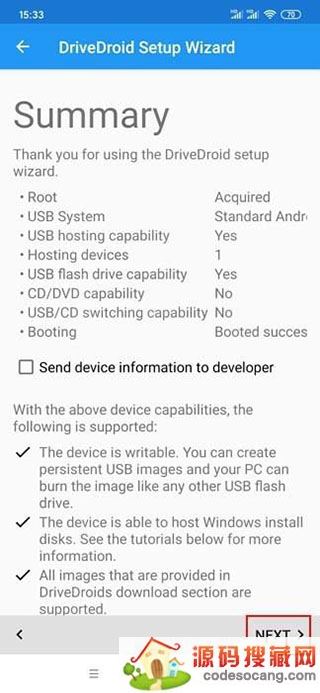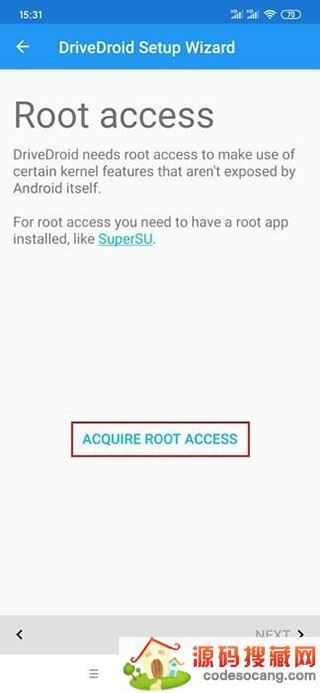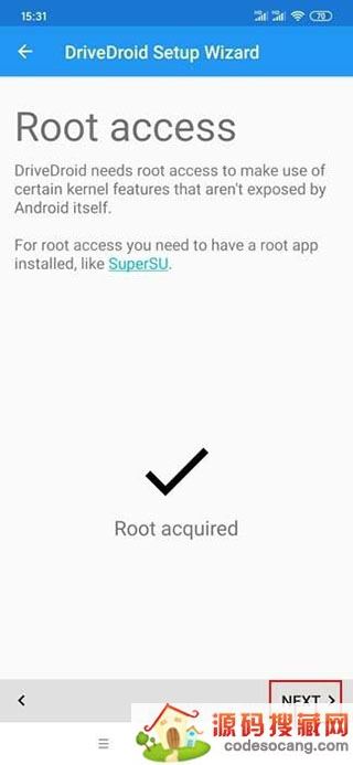 成功后会显示Root acquired(已获取root权限),点击NEXT(下一步)