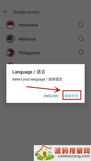 3、点击国旗图标将地区设置为新加坡,点击continue后,在弹出的对话框内选择简体中文即可设置成功。