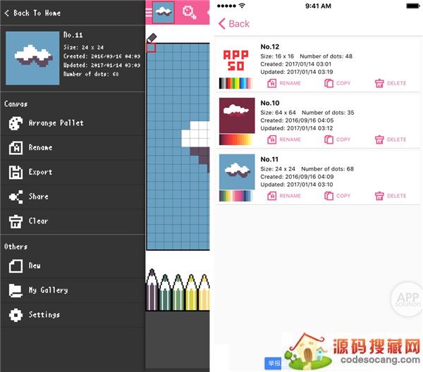 3、dotpict 对作品的管理十分详细,你可以清晰看到作品的名称、色盘、创建时间等等信息。
