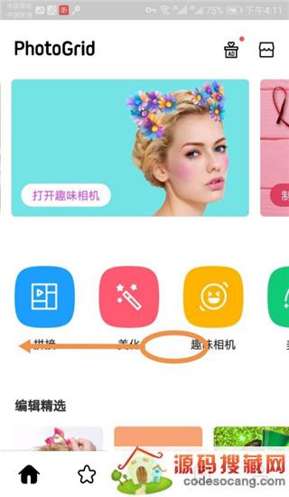 1、首先需要点按手机中的PhotoGrid应用标志,进入该应用主界面后点按界面中圆圈所在位置向左侧滑动屏幕,如下图所示。
