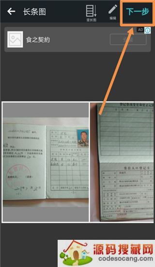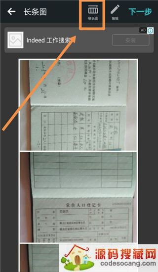 6、在之后的界面中这些添加的图片自动拼合成了一个竖着的长图,如果想将其变成横版的长图,只需要点按箭头指向的横长图即可。