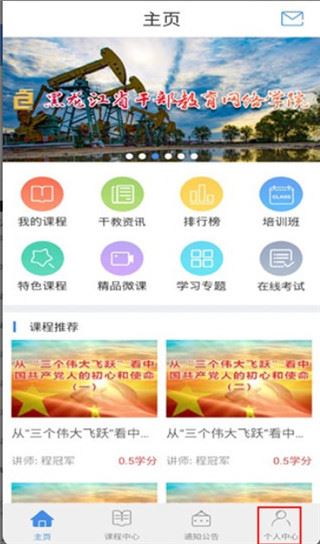 1、首先进入软件主页,这里可以看到我的课程、干教资讯、排行榜、特色课程等,点击个人中心;