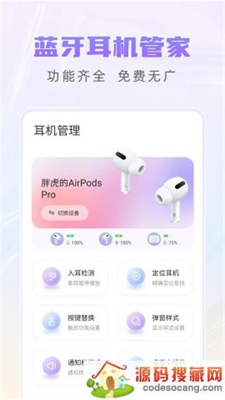 airpods king手机版,这是一款完全免费的蓝牙设备管理的软件,其中主要功能就有耳机电量弹窗、入耳检测、定位查找耳机、按键替换、通知栏查看电量、桌面电量组件设置、弹窗样式设置、通知栏样式设置。值得一体的就是入耳检测功能,在这里包括自动入耳检测和充电时停止播放,按键替换支持轻按耳机一下、两下、三下,同时大家还可以设置播放暂停、上一首、下一首、语音助手、播报当前音量。