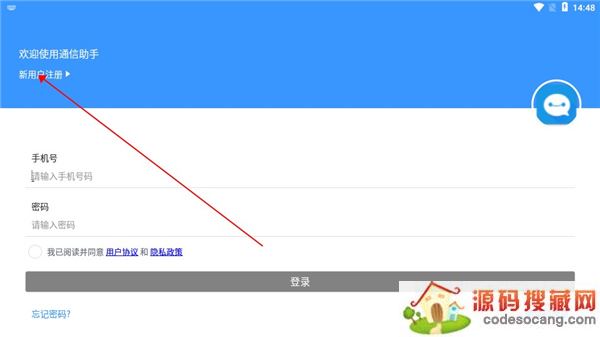 1、在本站下载安装并打开通信助手app,进入软件,点击新用户注册,进入页面。