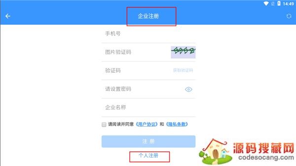 2、用户可以选择企业注册和个人注册,填写电话号码获取验证码即可注册成功。