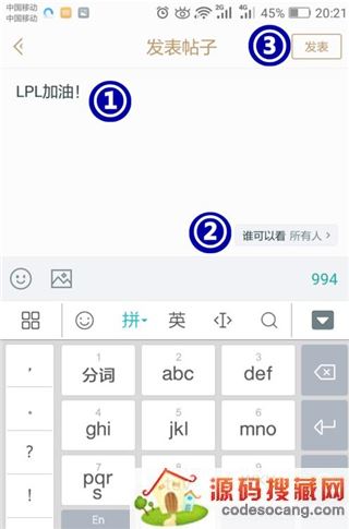 7、进入发帖文本编辑界面,输入内容后,选择“谁能看”的选项,然后点击“发表“,如下图: