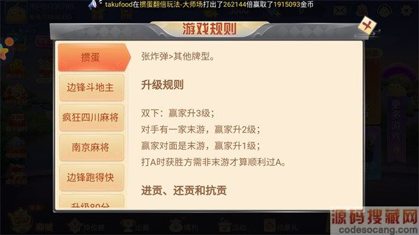 ①双下的话赢家升3级;对手一家末游的话赢家升2级;赢家对面是末游的话赢家升1级;打到A的话对手必须双下才能赢。