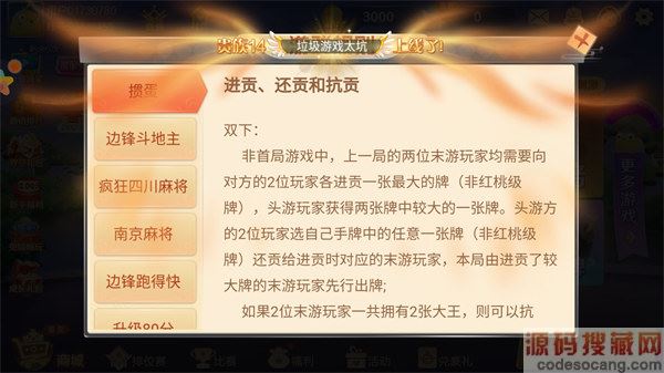 ②单下:非首局中,上一局末游玩家向头游玩家进贡一张除红桃级牌外的最大的牌,头游玩家还贡除红桃级牌外的任意一张牌,如果末游玩家拥有两张大王可抗贡。