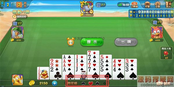 我们有两张配牌,按照淮安惯蛋规则可以组黑桃、红桃、梅花,三种同花顺。