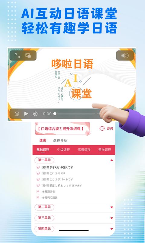 【哆啦日语,日语学习新体验】专为日语爱好者量身打造的日语学习软件,不管是兴趣爱好、工作需要、日语高考、日语考研还是去日本旅游、看动漫、听日语歌,哆啦日语都是大家日语学习的好帮手,更是一位零基础日语学习者的“好老师”!【功能特色】1.入门到精通一步到位课程体系分为5个标准等级,假名、中日英、罗马音、活用、词组等都有涵盖,学完可以达到日本语能力测试N1水平,并且提供三个学习级别,分别是N3,N2,N1。在拓展方面,主要由听-说-读-写-测五部分组成,从入门日语五十音图到JLPT能力考N2、N1,涵盖日语单词、语法、会话、阅读、听力等各个方面,教学练评测五位一体。2.学习库-完备的日语词库主流日语教材词库:《标准日本语》初级中级、《新版中日交流日本语》初级-中级、《大家的日本语》1-2、《新编日语》1-4,红蓝宝书等,词库与教材一一对应,顺序都一样哟~日语能力测试N5-N1词库,各类重点、核心词汇一应俱全,考试突击背单词不用愁!3.专业的日语课程讲解日语教学中外教老师带你由浅入深学习日语入门训练营、日语免费中外教公开课、日语自学体验课。无限回看上课内容,课前预习、课后复习,不管是用手机、电脑还是ipad;随时随地实现交流互动。【大品牌,好服务】7年线下+4年线上日语教学经验,服务学员人次超千万与国内外大学、出版社及教育集团深入合作东京武汉两大教研中心【联系我们】官方网址:www.vipdora.com客服热线:400-996-2169客服微信号:vipdora002邮箱:service@vipdora.com快来一起学日语吧!我们在日语的世界等你哟~