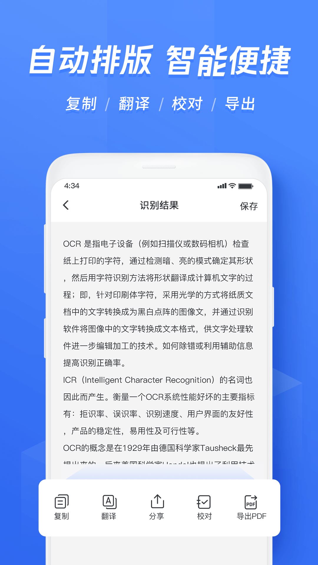 迅捷文字识别可用于拍照翻译文字、图片文字提取、公司文件转录、纸质书阅读笔记摘录、截图文字内容提取、身份证识别、购物小票识别,纸质文件电子化存档等等多种场景。功能亮点:1、云端识别。云端ocr识别引擎,识别准确度随着自动学习越来越高,识别速度快;另外可以放心的是,图片上传经过加密处理,无需担心隐私。2、批量识别。同类app里的*者,能一次识别9张图片,批量识别后也可以对多张原图同时进行校对。3、支持系统相册识别,无需打开APP即可快速完成识别。4、识别结果自动存为历史记录,检索方便。5、支持表格识别。6、支持长图识别和多栏文字图片识别。7、自动识连续拍照扫描件。如果有多张文档待生成扫描件,只要相机对着每张文档即可全部自动拍出来。8、灵活选择。手指流畅顺滑,即可分块选择需要的文字,想要哪段点哪段(想查看所有文本,不需要按行点选)9、快速校对。在识别结果页面点击“校对”按钮进行校对,可以在不离开编辑区域的情况下方便对照着原文修改,弥补OCR技术的不完美之处。