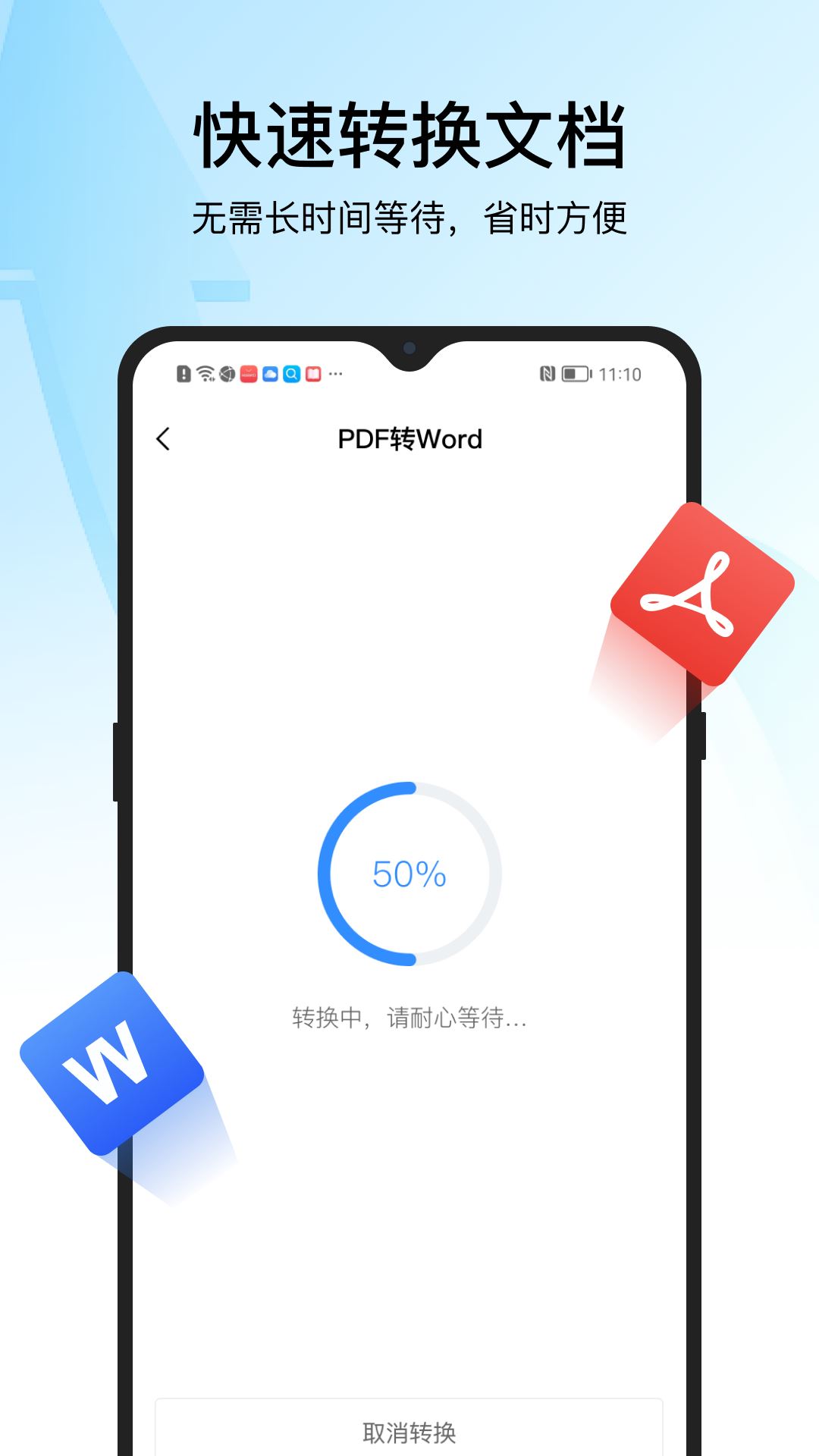迅捷PDF转换器是一款提供文件格式转换的办公应用。支持一键完成PDF文件与Office、HTML、TXT和图片文档之间的格式转换,轻巧简便,快速转换,每天转换文档数量100000+,是移动办公方面好用的文件格式转换小助手!【功能特色】1 将PDF转换成为不同文件格式可支持将PDF转换成为Word、Excel、PPT、HTML、TXT和多种图片格式(JPG、GIF、PNG等)。2 支持办公文档转换成PDF可在手机移动端将Word、Excel、PPT和多种图片格式(JPG、GIF、PNG等)转换成为PDF格式。3 高清转换无乱码强力高清转换核心支持深度互换,转换过程不会降低文件质量,不会产生异常乱码,办公推荐。4 便捷文档管理功能提供文档转换记录能够归档转换后的文档,确保转换前后文档管理更简便,不会产生多余的临时文件。除此之外,在使用过程当中遇到难以转换的文档,还可以连载在线技术客服,获取即时远程协助,帮助实现完美文档转换哦!