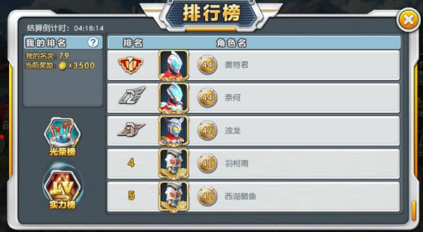 由于目前还在调试中,排行榜只有2大块,分别为”光荣榜“,”实力榜“。