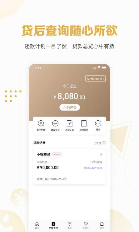 4、查询:贷款申请进度随时掌握,还款计划一目了然,贷款总览心中有数。