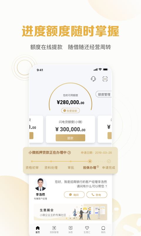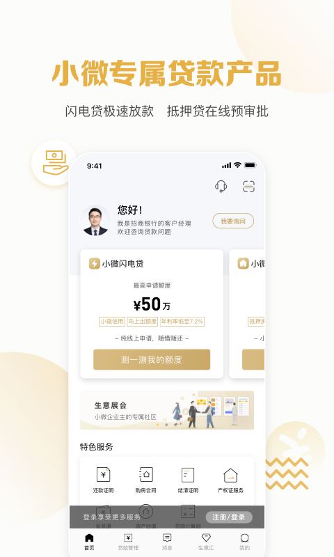 招商银行支持实体经济发展、积极践行国家普惠金融的号召,为小微企业主提供贷款资金、业务咨询、会议服务、企业展示等综合金融服务。功能特色: ? 专属客户经理在线服务无需跑网点,不用找中介,招商银行官方认证的小微客户经理一“触”即达,一对一为您提供专属在线咨询服务。 ? 一站式全流程贷款体验借款:一键申请,线上贷款*快30秒出额度,提款到账*快只需1分钟 预审:小微抵押贷款在线预审批,周转易、随借开通后可在线随还还款:支持当日紧急还款、逾期还款、预约提前还款查询:贷款申请进度随时掌握,还款计划一目了然,贷款总览心中有数 ? 生意汇 聚优企享经验生意展会:免费为招行优质生意贷客户提供企业展示、产品展示的平台生意故事:分享小微企业,小微企业主们和个体工商户的创业成长故事 ? 特色综合金融服务线上贷后服务:在线预约产权证复印件、购房合同复印件、还款证明、结清证明贷款实用工具:房产在线估值、贷款计算器