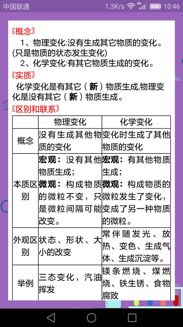 重点化学知识:包括了初中所有的重点化学知识点,各种基本概念、常见物质的颜色和状态、物质俗名及其对应的化学式和化学名等。