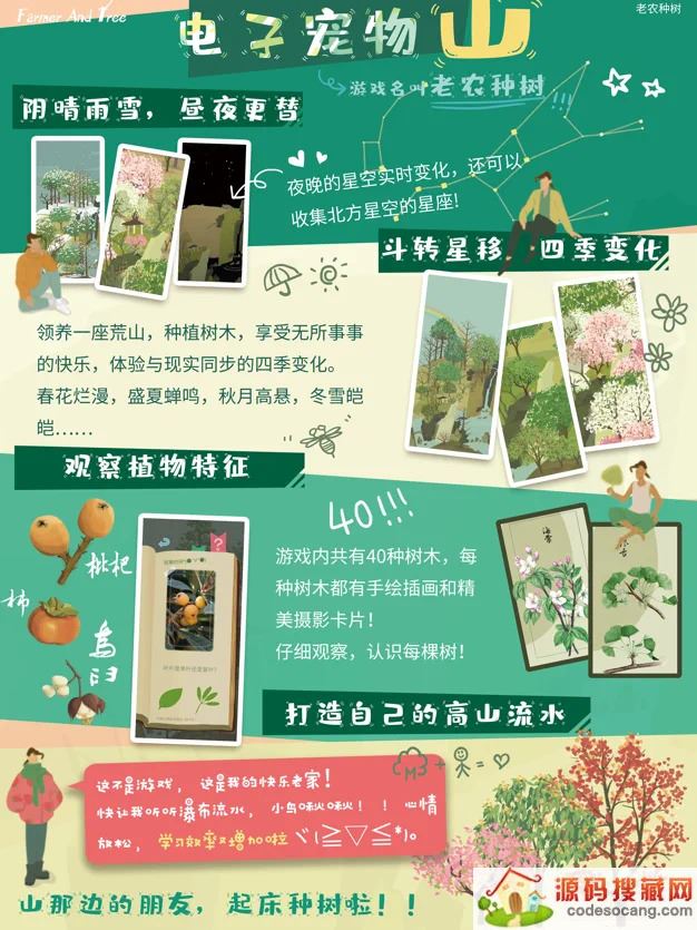 「老农种树」的剧情于每年春分开始连载,次年春分结束,带来一整年的快乐!剧情收集完之后,依然可以继续体验种树的快乐!每两周一个【主线故事】,只要山上有树就可以解锁,不论何时开始养山都不会错过!每周另有【支线剧情】可以【根据上山种下的树木种类,多少,年龄等】触发,山友们要认真种树哟ψ(`)ψ每个季节增加10种树木和对应的图鉴卡片,如果有精力还可增加一丢丢其他玩儿法。【不肝不氪】种下一棵树,岁月自然发生。在俺们山上,一切都随时间流逝:获得新卡片,解锁新剧情,一切都安静平稳~(路人甲:嗨,还不是没别的内容可玩儿?)(路人甲出局)【实时连载】故事从春分那天开始……每周解锁一至两封信件,看看山上正在发生什么故事?住在附近的陌生人,路过的小姑娘,上山赏花的老爷爷……从孤寂的荒山开始,直到万物生发,耐心,平和,时光会送来礼物~(路人乙:总之就是剧情很少是吧?)(路人乙出局)【会面动物友人】根据山上树木的不同,解锁不同剧情信件。随信件认识新朋友,也随信件收集新图鉴……咦?来者到底是人是猫?(路人丙:咦,有角色立绘吗?没有啊,没有谁在乎是……)(路人丙出局)【每季十种树木】观察卡片,赢得种子,栽种树木!春夏秋冬,每季都有十种树木等你来栽培!更有数十种图鉴卡片等山友们发现~~既种树也认识树,从陌生到熟悉,与树为邻,收获共处的快乐!(路人丁:……)(路人丁:好!)(路人丁获得一朵小红花!)愿与各位山友一路同行!Copyright 2019-2022 版权所有